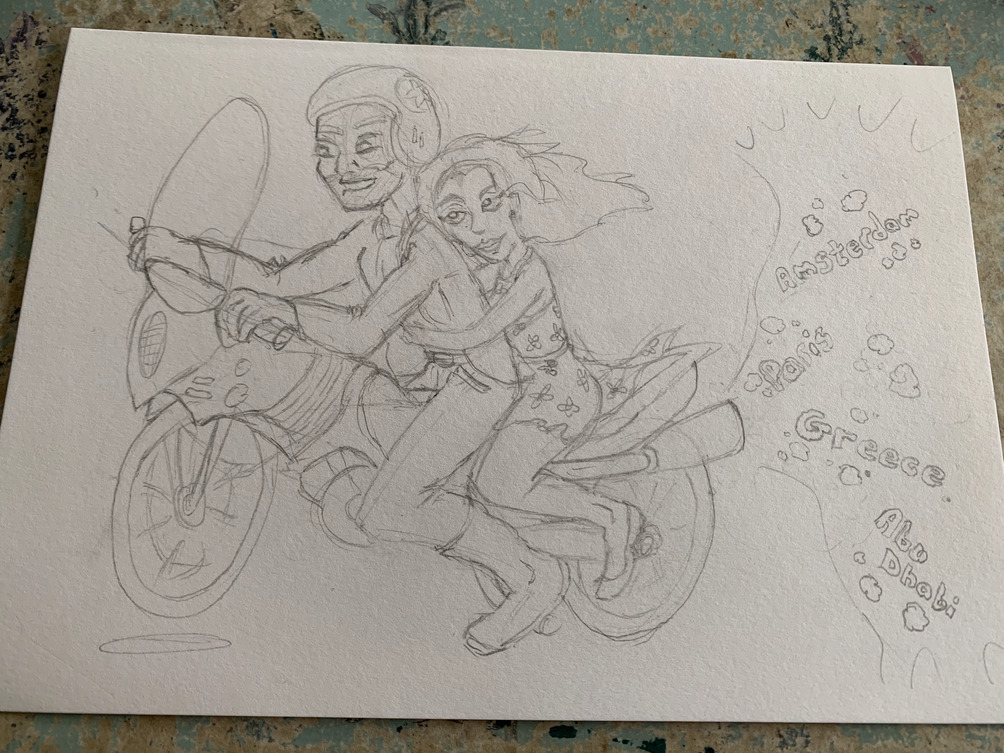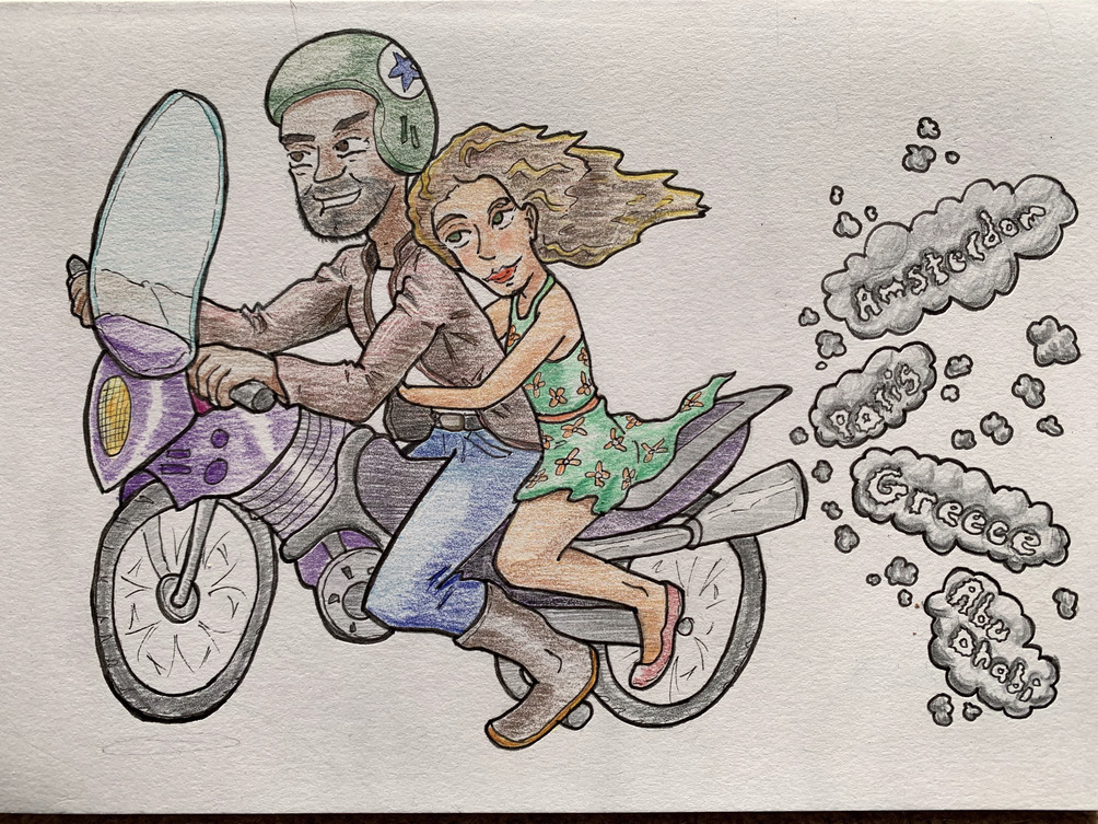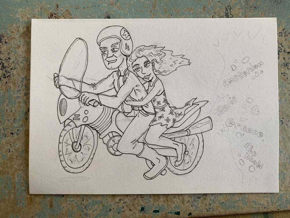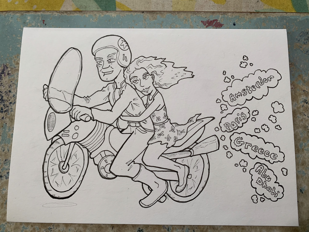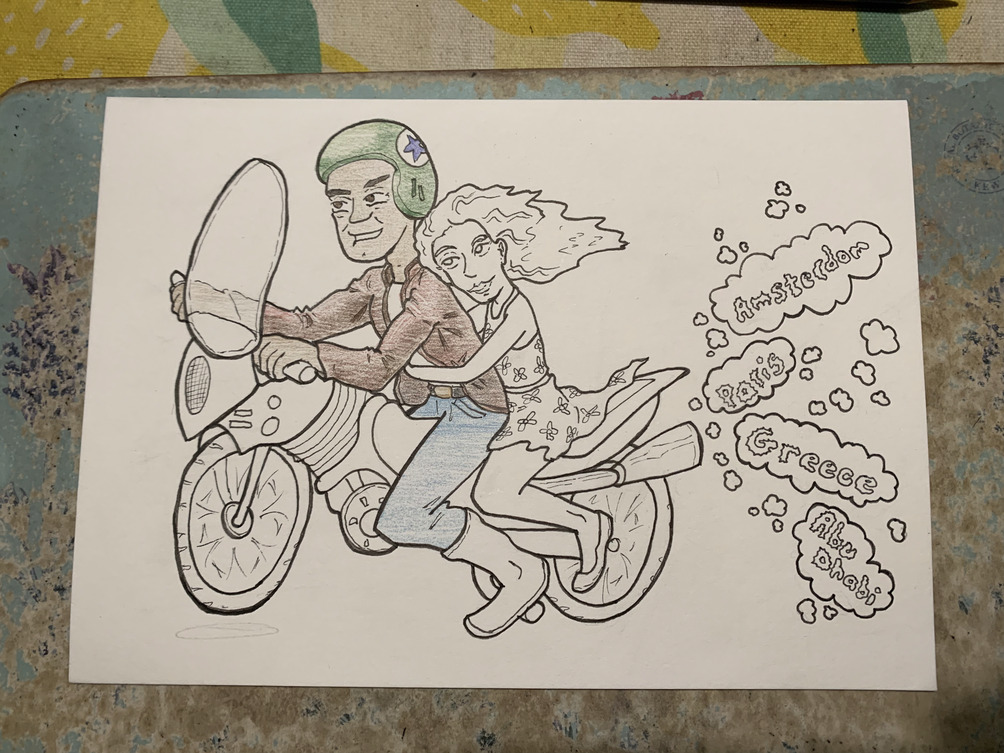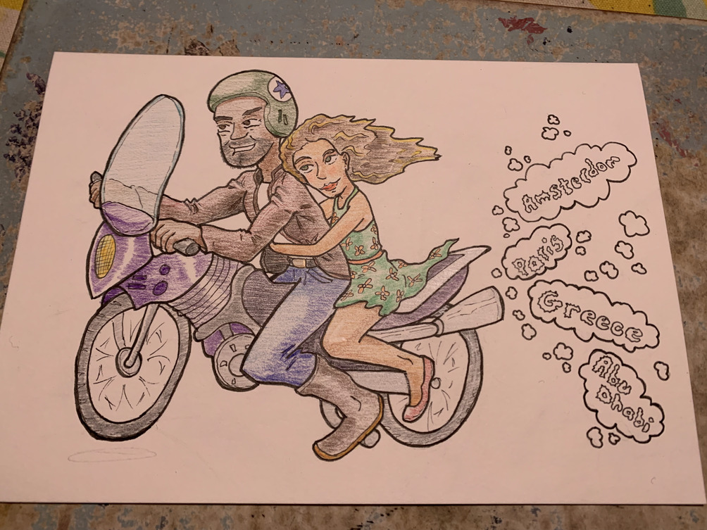 This card was produced for George to celebrate the one year annivesary between him and his fiancée. George asked the card to personalized to show him and his fiancée riding George’s motorcycle with names of the places they had been formed in the exhaust smoke.